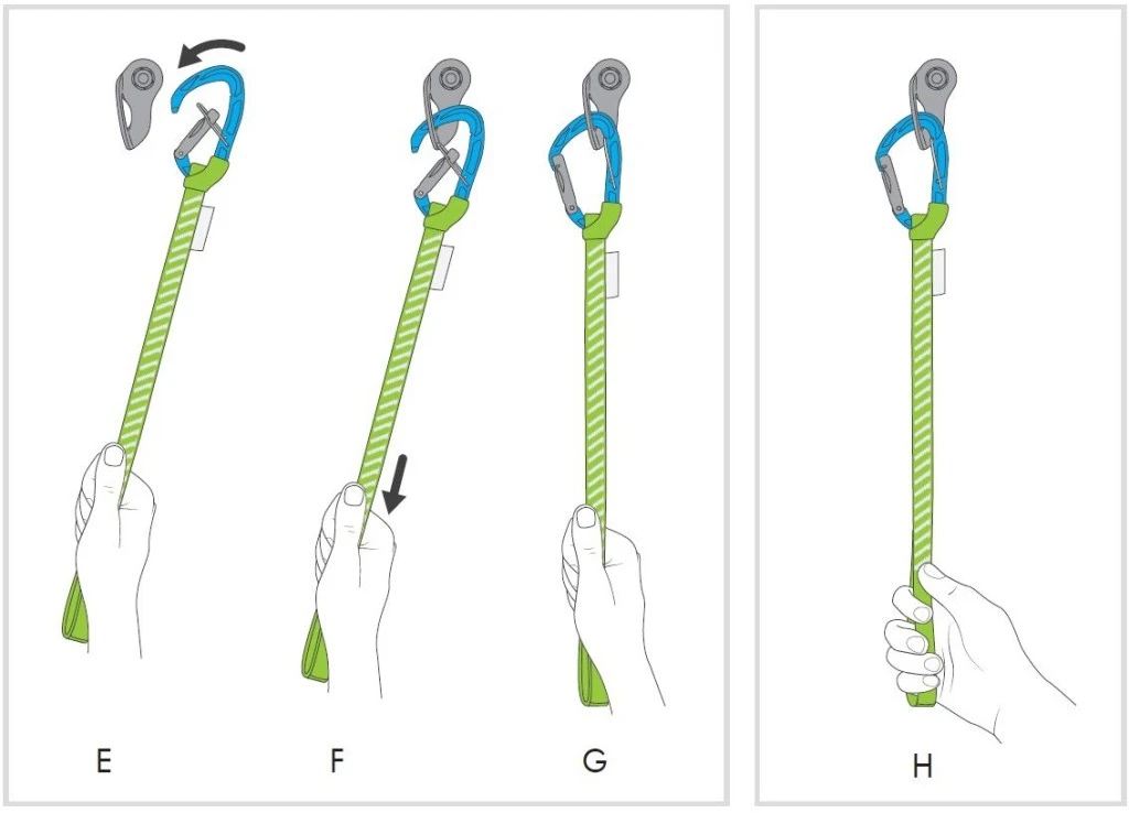 Dankzij de lange lus en het TRICKY LEVER-systeem dat in het lichaam van de karabiner is geïntegreerd, is het mogelijk een belay-punt vast te klemmen dat iets verder weg ligt. De poort van de karabijnhaak wordt opengehouden en sluit automatisch zodra het systeem tijdens het vastklikken naar beneden wordt geladen.