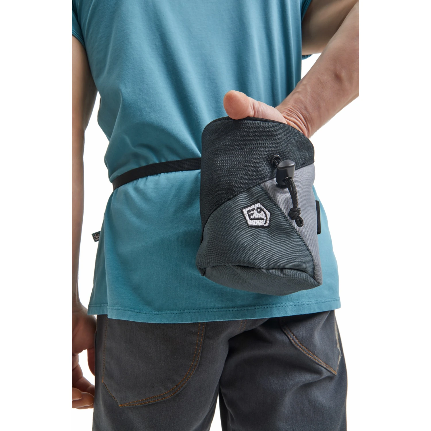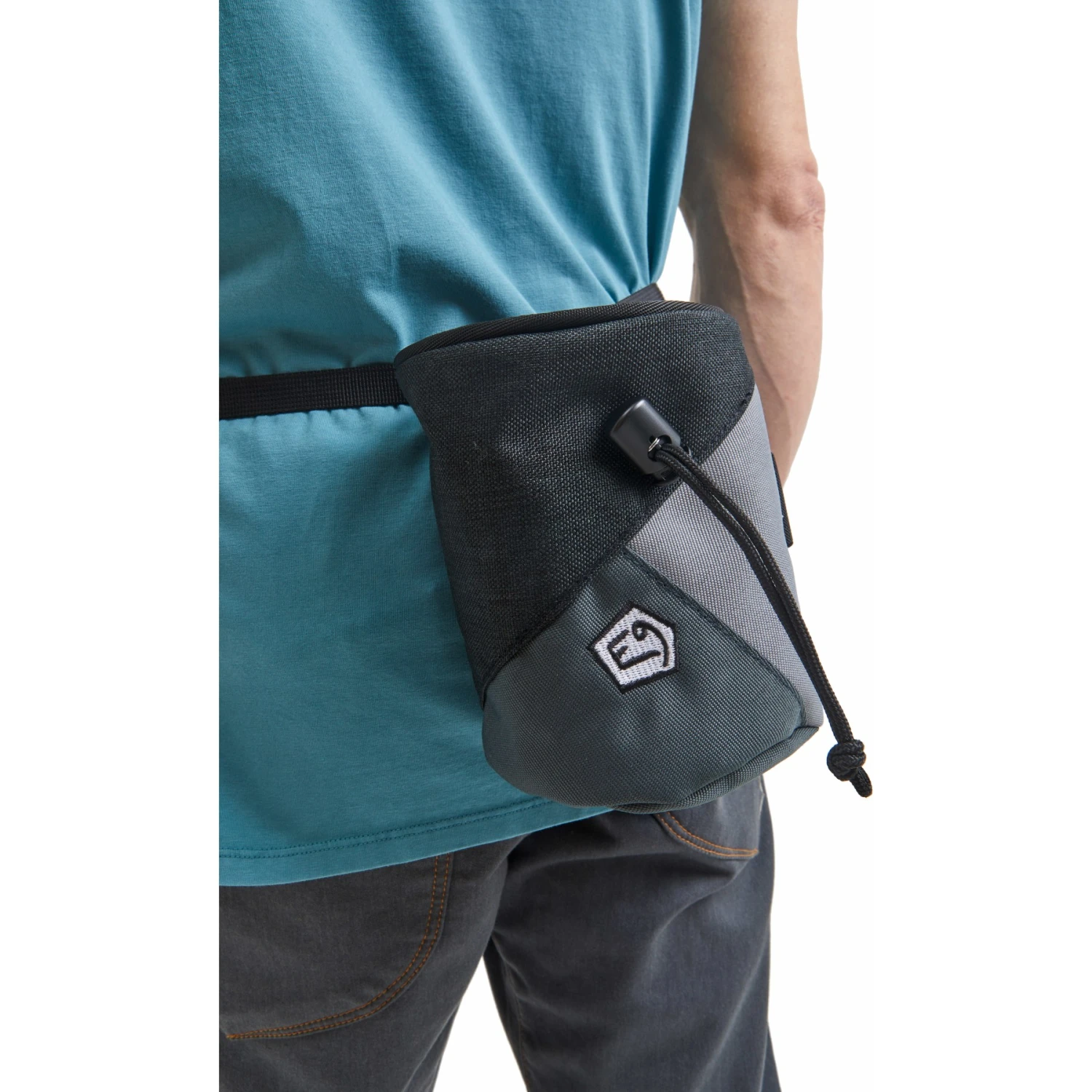 Een grote, stijlvolle krijttas met verstevigde opening en verborgen koordsluiting. De driekleurige afwerking en de geborduurde E9-patch in zwart en wit geven het een vleugje pit. Andere details zijn een houder voor de boulderborstel en een krijttasriem.