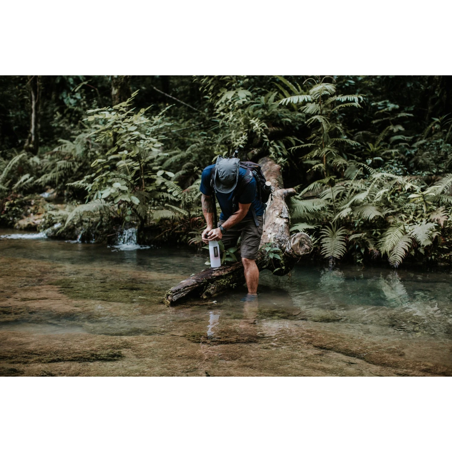 De waterfilter past in elke rugzak of bekerhouder, hoeft niet te worden ingesteld en produceert 500 ml schoon water in slechts 10 seconden (3 L/min). Onopvallende filtratie en zuivering voor wandelaars, backpackers, jagers of avonturiers die discretie en snel stromend gezuiverd water zoeken om te drinken, watercontainers te vullen of te koken.