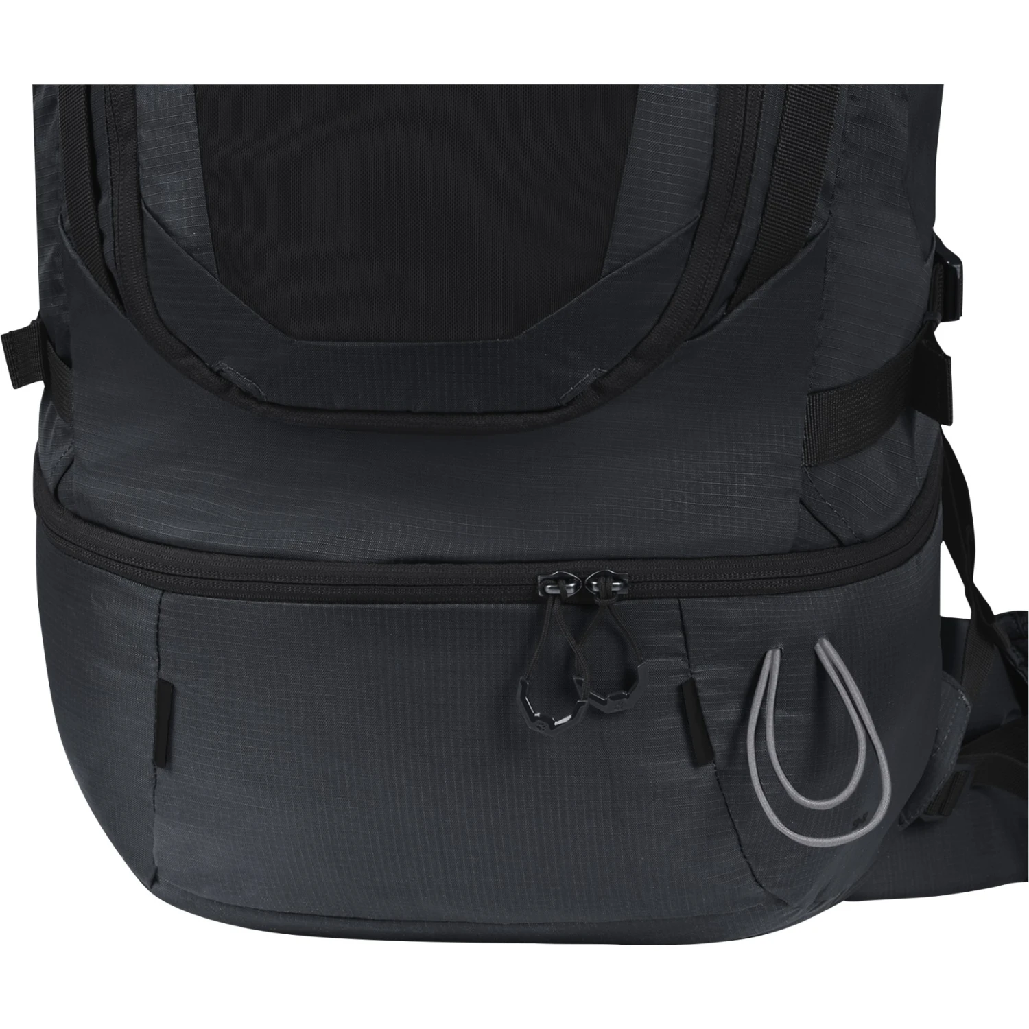 Het dekselvak gaat wijd open dankzij de extra lange ritssluiting. Je kunt je waterfles op de heupgordel dragen of een drinksysteem gebruiken. Je hebt toegang tot het hoofdvak via de bovenkant of via de rits aan de voorkant. Indien nodig kun je je natte regenjack in de grote elastische zak van gaas aan de voorkant stoppen. De ruglengte kan individueel worden aangepast.