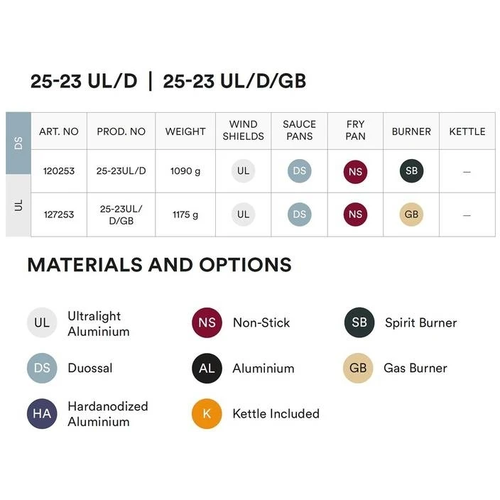 is Trangia’s unique super laminate. Duossal 2.0 is a perfect combination of two materials in one, pressed together under high pressure. Aluminium on the outside for good thermal conductivity, and stainless steel inside, which makes the pans scratch resistant and easy to clean. Duossal pans are durable and heat up quickly. The thickness of the material is a total of 0.8mm. Stainless steel 0.3 / Aluminium 0.5 mm.Â